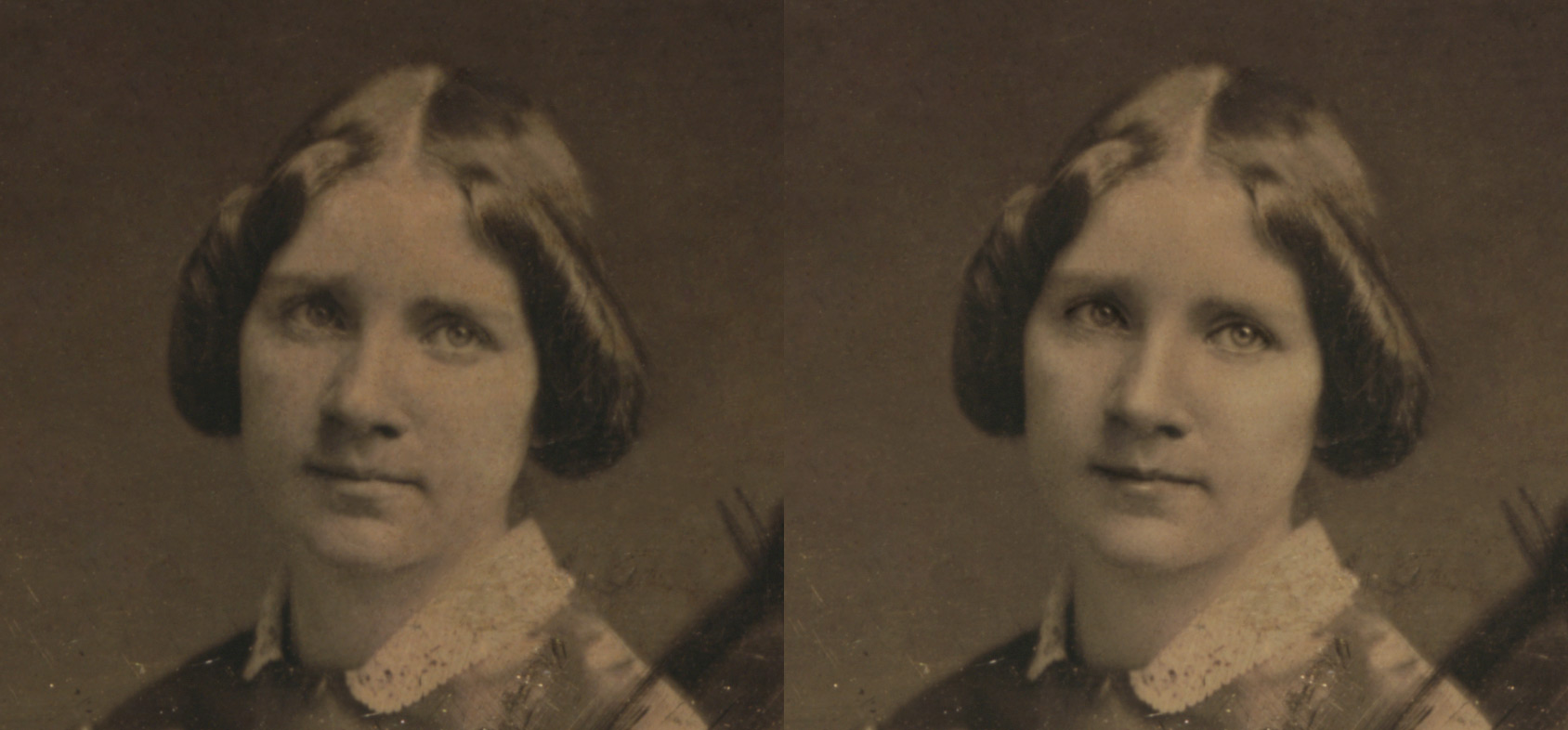 The other day I posted a bit of restoration I’d done on my Facebook page. The image, a lightly restored copy of a portrait of a Miss Dorothy Draper, is beautiful, I think, and so did others who commented. One comment got me thinking, though: “She’s a very pretty woman for those times!” I knew what the poster meant, of course. People looked the same then as they do now, it was the photography that was different. It was a relatively new medium in late 1839, early 1840 when the portrait of Dorothy Draper was taken by her brother Joseph, and since it’s believed to be the oldest photographic portrait in existence (the oldest self-portrait of Robert Cornelius was taken around the same time), all the details were experimental, at best. Yet Dorothy Draper looks quite pretty in her portrait, much more so than most people pictured even decades later. Did Joseph Draper simply “luck out” with lighting and exposure? Was his sister just so extraordinarily beautiful that she looked good, no matter what was thrown at her?