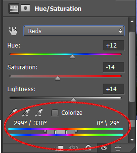 Once the redness / purple is isolated, go back to the Hue / Saturation sliders and zero them out.