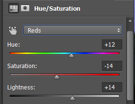 The first thing you’ll want to do is to take as much of the red out from the acne and surrounding areas. That will make the actual removal of the blemishes very much easier. To do this, make a Hue / Saturation Adjustment layer. Since it is the red we’re trying to get rid of, set the drop down menu to Red. Now move the Hue slider to the left and then the right – the goal is to find the color that makes the acne stand out the most.