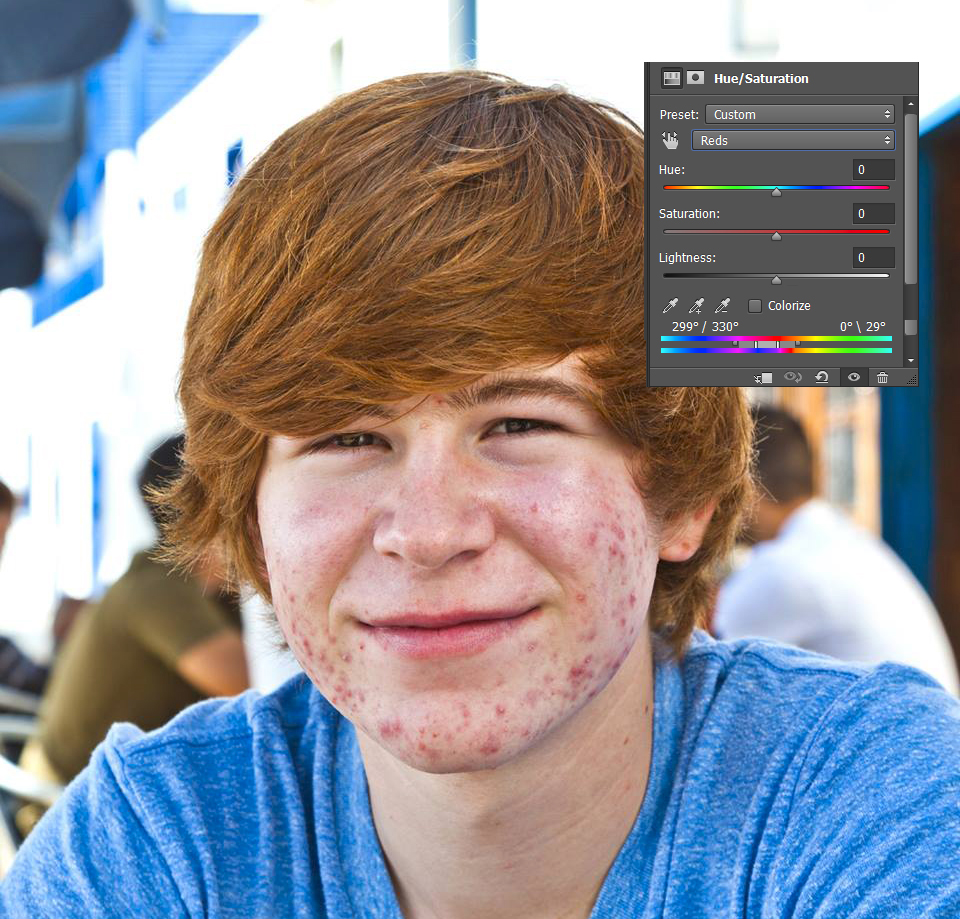 Now move the Hue, Saturation and Lightness sliders until the acne becomes as close to the color of the surrounding skin as possible. It will more than likely make the skin on the yellow side, but that’s ok. We’ll add some red back in shortly.