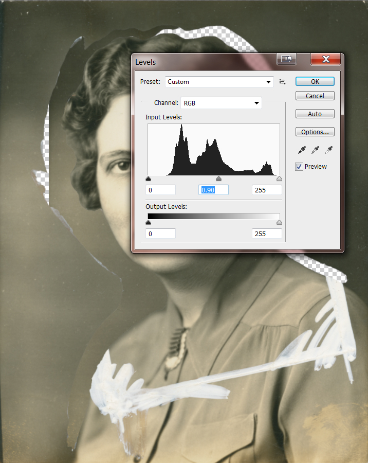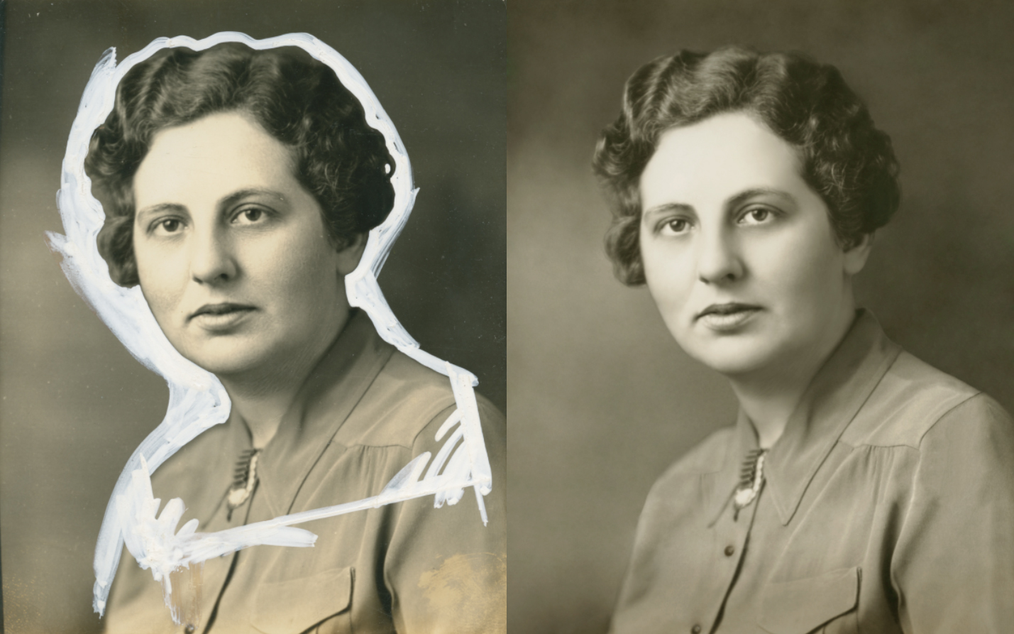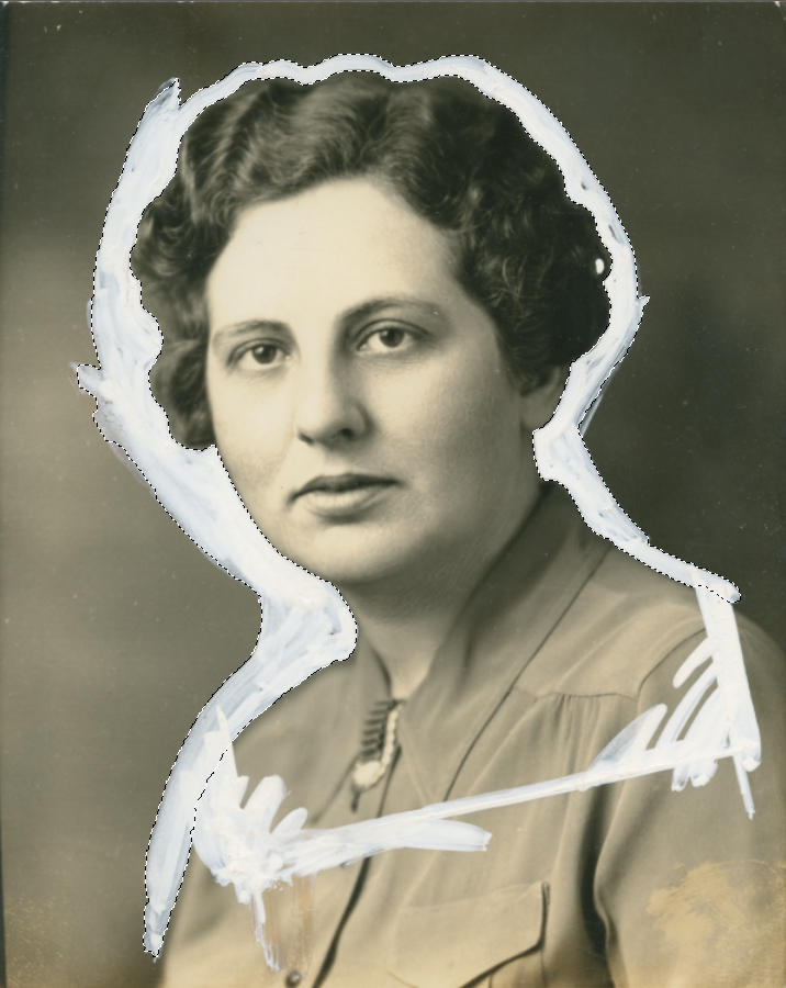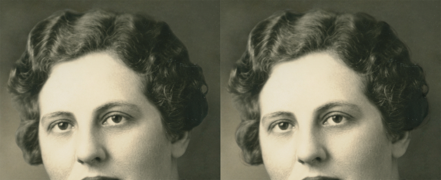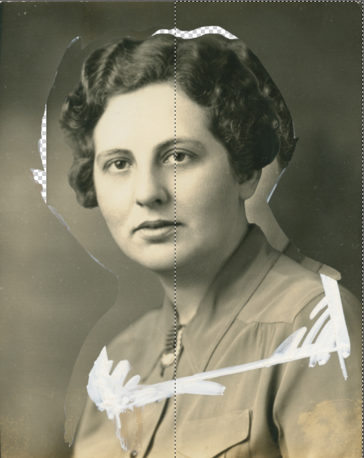 What you see, below, is an aberration, a crime committed against a helpless photograph. Yes, a real photograph was harmed in the making of this mess. Why it was done is beside the point; it was done many years ago and now this image remains as one of the few a daughter has of her mother. This may not be a situation that comes up for the majority of you, but in case it, or something like it comes up, there’s a fairly easy way to get the white out…out.