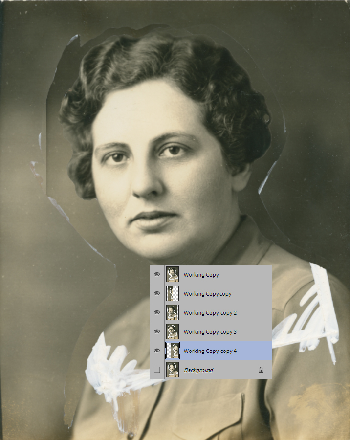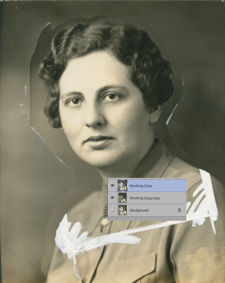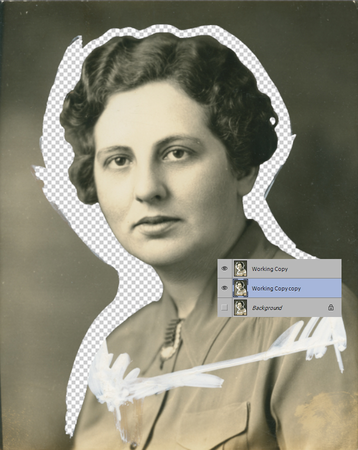Note that I’ve left the strip of white out across the body alone. Next we’ll duplicate Working Copy, and move the copy below it.