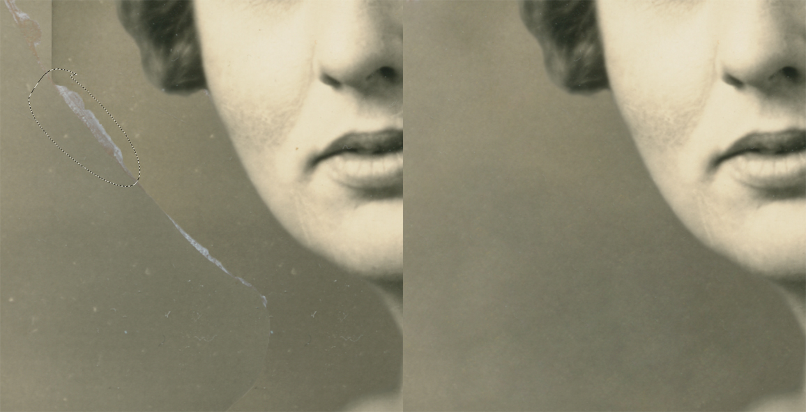 Once all the sharp edges are softened combine the top two layers into one and grab the Patch tool. Zoom out to 100% and select small bits of the area that was extracted and refilled. Drag the Patch tool over to blend. It’s also a good time to patch some of the other specks and spots, if you’re so inclined.