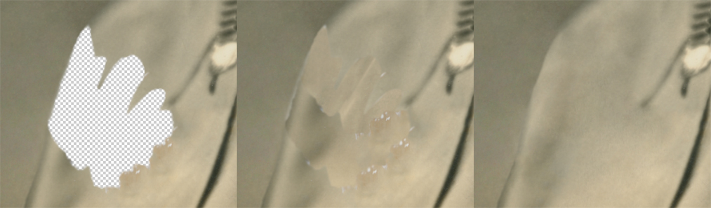 On to the white out in the body, now; some of the smaller areas can be fixed using the Patch tool and Content Aware Fill. I did all this below with Patch and Content Aware Fill.