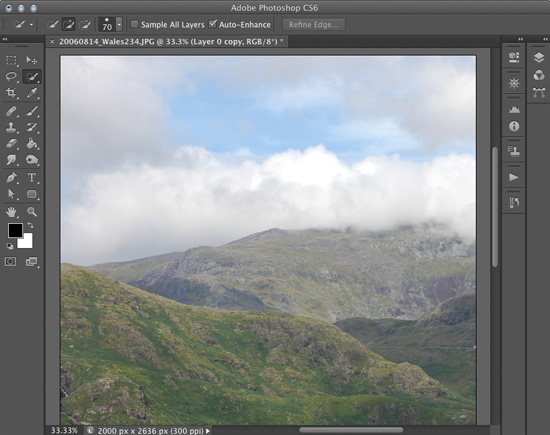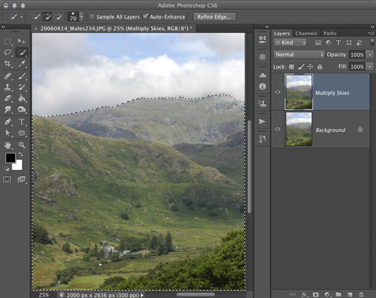 Next, use the Quick Selection tool or whichever you prefer to select everything but the skies. Don’t worry if it’s not exactly perfect; just get it close so that we can shore things up with the Refine Mask feature.