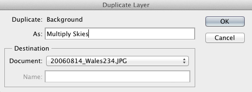 First, duplicate your Background Layer by right-clicking above the layer’s name and choosing Duplicate Layer. In the dialog box that pops up, choose a name and make sure the same image is selected in your Destination menu (this is the default but it can’t hurt to check). When you’re done click OK.
