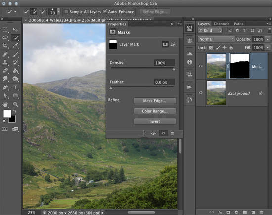 Now click the New Layer Mask button at the bottom of the Layers panel (third from left); it should generate a new layer mask to accompany your new Multiply layer. From there, open the Properties panel (Photoshop CS6 only — use the Masks panel in CS5) and click the Invert button. This will flip your mask so that only the skies will be affected by the Multiply effect.