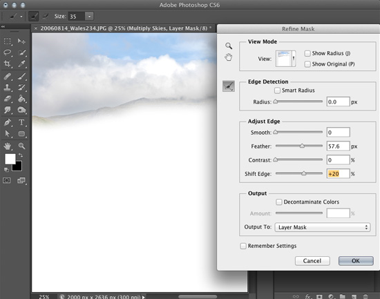 Next, use the Feather and Shift Edge settings to make sure the selection / mask extends as far as you need it to, and that there is a soft transition. This will avoid creating any halo-like effects or harsh edges when we apply our changes to the layer. Click OK when you’re done.