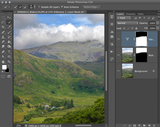 Now all you need to do is switch the Blend Mode of the new layer to Multiply, and adjust the Opacity to taste! I’ve also added a Vibrance layer for fun. However I didn’t want to over-saturate the sky so I “borrowed” the same layer mask I used for the sky layer, and inverted it that so that only the ground is effected. The best news of all is, when you use this technique in real time it should take substantially less time than it took you to read this tip! 🙂
